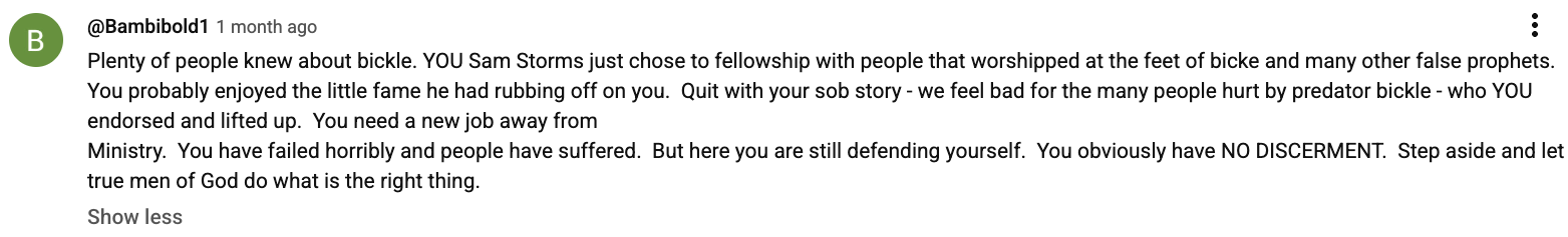 You say once again, “just the way Sam Storms tells it.” When you say it like this you are giving people the impression that I am saying that in the present day. That is false. Why wouldn’t you be more accurate and say, “just the way Sam Storms told it in the past, when he was still under the impression that Bickle was trustworthy?”