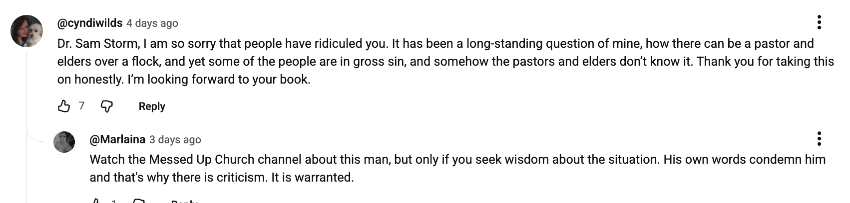 (As you can see, Sam Storms really wants me to respond, and is threatening to expose me if I don’t apologize for “repeatedly lying” and “slandering him.” It appears that he might have convinced Laura-Lynn Tyler Thompson to remove most of the negative comments about him on her video interview on Jan. 8th, 2026. Click on the right side to view the screenshots/comments. -S.K.)
