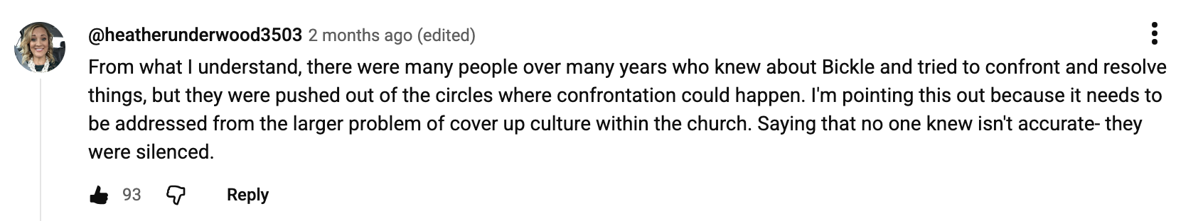(I never said you were “covering up Bickle’s abuse and sexual mistreatment of young women.” If I did believe that was true, I would continue saying so. I know how much you want to make me appear guilty of this, but either you still don’t understand my point, or you’re intentionally ignoring it to make me look bad. But if you would just take your mistaken idea to its logical conclusion, you would have to believe that I accused you of this terrible thing and then I immediately denied it. If I didn’t want people to know I accused you of that, why would I leave my comment up? Why would I go through all the trouble of explaining myself when I could just remove my comment and end the problem? Do you even know how comments function on YouTube videos? The truth is, I explained myself until JonMark understood my point and said, “That’s a fair point.” Once again, here is the simple point I was making: