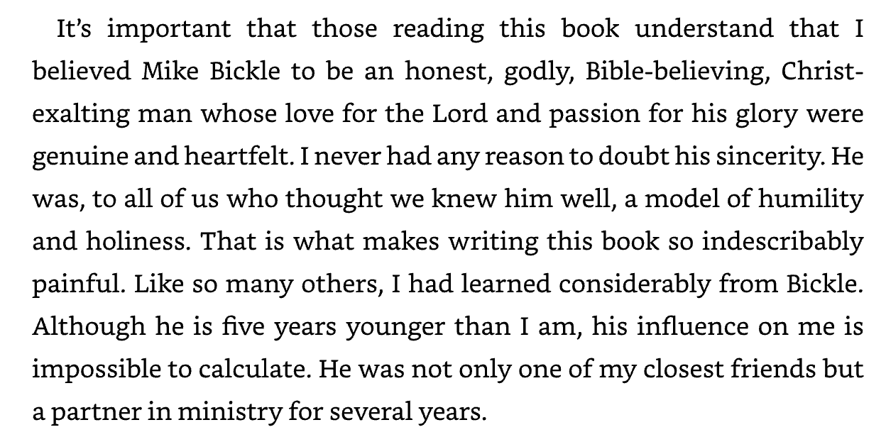 I can’t believe you would say that I affirmed Bickle as a great guy although he was sexually abusive. You are lying about me. I never ever affirmed Bickle again once I learned of his deception and sexual misconduct. You clearly make it sound as if I continued to affirm him as a good person even after I discovered his extensive sexual sin and double life. Why are you doing this? This is slander pure and simple.