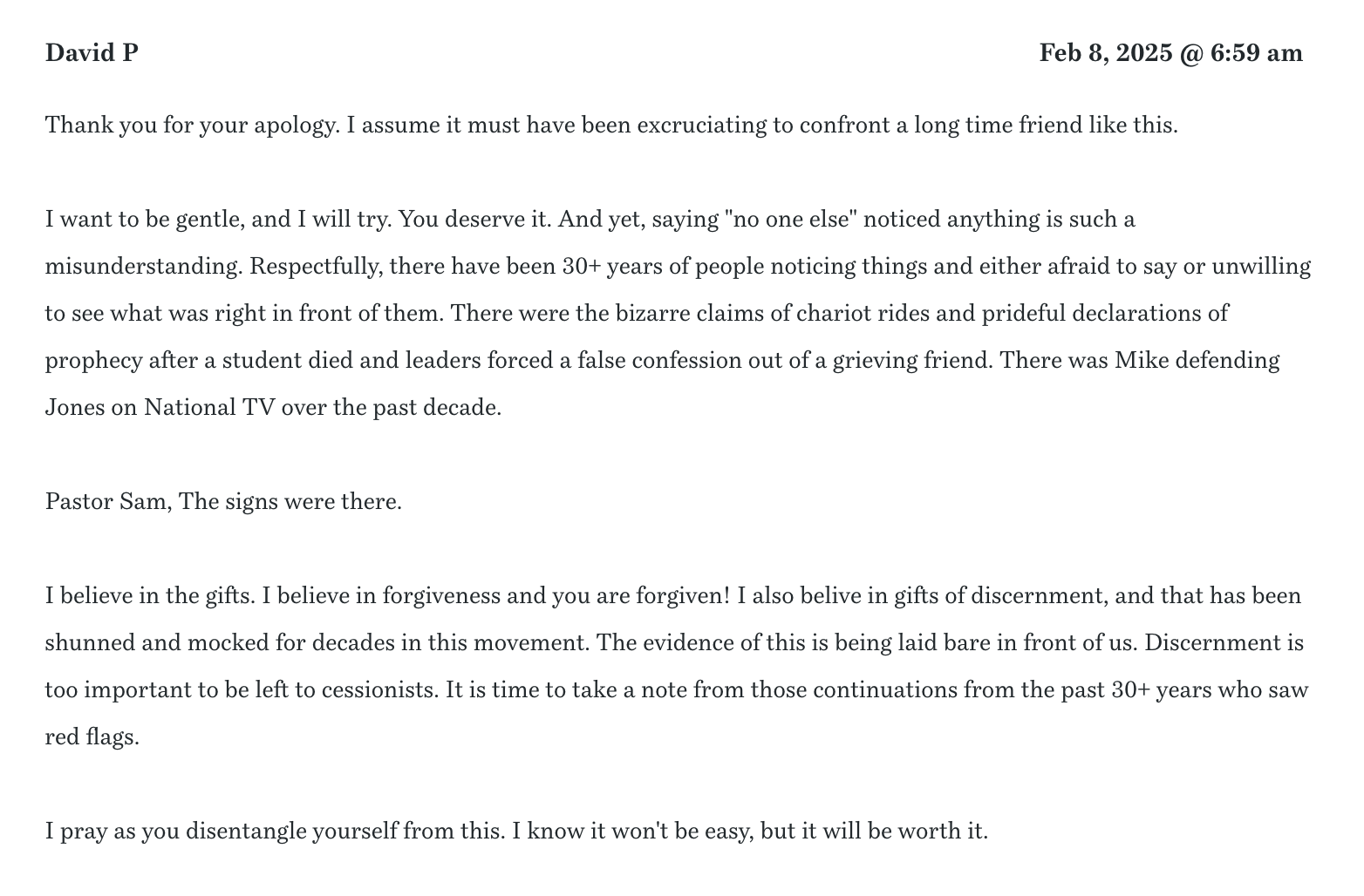 [I posted the following article on my blog, www.samstorms.org, on February 7, 2025. I was moved to do so after watching the interview of Deborah Perkins by Julie Roys on February 3, 2025, a podcast which you can access at www.julieroys.com. It is titled, Mike Bickle’s Primary “Jane Doe” Comes Forward.] (Yes, I know about that podcast and was one of the first discernment ministers to bring it to the public through my YouTube channel.)